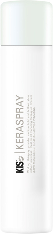 KIS KeraSpray is een fijn verstuivende, super houdbare aërosol die voldoet aan alle moderne eisen. Niet belastend voor milieu. Geeft een zijdezachte glans, volume en houdbaarheid aan ieder kapsel, zonder te plakken of te schilferen. Vochtafstotend en makkelijk uit te borstelen.